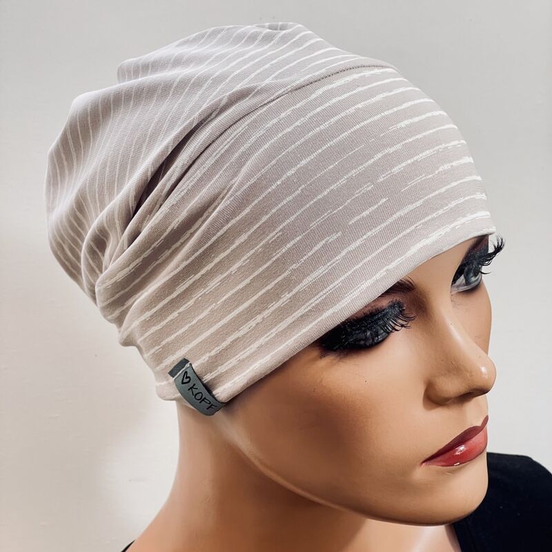 Entdecken Sie unsere speziell von mir entworfene Volumenmütze, die Ihnen während der Chemotherapie oder bei Haarausfall ein Gefühl von Sicherheit, Komfort und Stil zurückgibt. Diese Mütze wurde entwickelt, um der natürlichen Kopfform zu schmeicheln und ein unauffälliges, voluminöses Aussehen zu bieten, ganz ohne Perücke. Kann auch hervorragend mit Bändern oder Tüchern kombiniert werden.